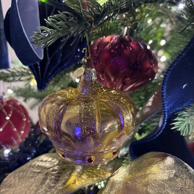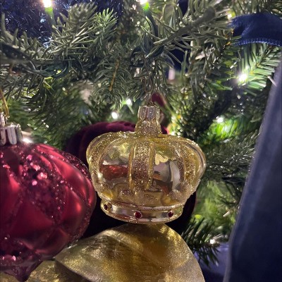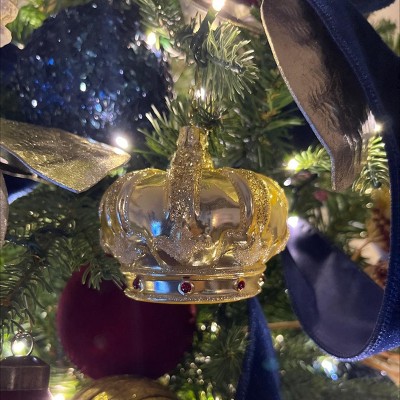 Top off your holiday tree with regal flair using this John Derian for Target Glass Crown Ornament. This shapely ornament features artwork from decoupage artist John Derian and is designed as a gleaming gold-tone crown with sculptural accents and trimmed with red dots on the base, topped with a "2025" inscribed disc charm. Intended for indoor decorative use, the glass ornament also comes with a built-in loop for easy hanging on your tree.