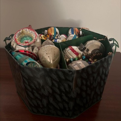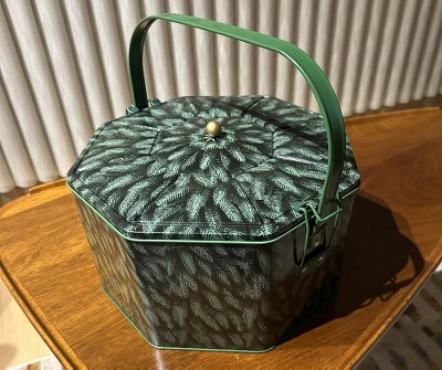 Beautiful Christmas tin. I filled my tin with vintage Christmas ornaments. It has a beautiful green pattern