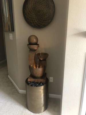 I love this fountain! It's perfect on my back patio. Heavy enough to balance well on a super heavy table without fear of being blown over by a stiff wind... and showing off the fountain's lovely sculptural qualities to best advantage. The lighting is an added bonus. And best of all... the sound of splashing water is exactly what I wanted! Noisy enough to really be heard and appreciated... even from inside, if the sliding doors are left open. I didn't want a wimpy fountain... and the reviews left by previous customers on your website let me know exactly what I was going to get!