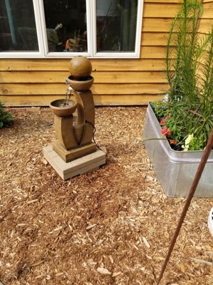 Highly recommend this fountain!! I love how the fountain doesn't have a defined backside. It looks really nice from all angles which was important to me since it can be seen from various areas in my yard. I looked for over 4 months and almost settled on a fountain but I'm so glad I waited and found this one. The resin color is exactly like the picture. The water sound is perfect as well. It can be adjusted to various levels which is helpful if you don't want a super loud water sound.
