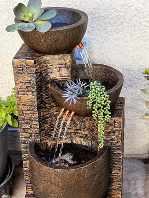 I love this fountain. I have been looking for a few years for a nice, not so tacky fountain, so many that I would see, where very dark and ugly. I liked the look of the cascading bowls with the copper spigots. It was easy to set up, the sound is perfect, it lights up and looks amazing at night. Fake brick look is somewhat tacky but in a good way. Very solid, does not tip over.