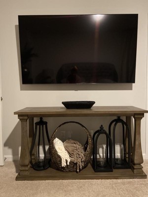 Homey. Hearty. Heavenly hued. Luring with a distressed weathered gray finish and square baluster legs set on a broad lower shelf for great presence, the Johnelle sofa table is sure to make your homestead feel that much more like home. The look is beautified with elm veneers and a framed and plank-effect tabletop for a richly crafted masterpiece made for years of satisfaction. Signature Design by Ashley is a registered trademark of Ashley Furniture Industries, Inc.