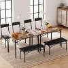 Enjoy comfortable dining with this elegant dining table set for 4 featuring premium upholstered bench and chairs with thick cushions. Crafted from high-quality MDF and steel, the sturdy frame provides excellent stability and durability. The waterproof and anti-corrosive tabletop is easy to clean, making this set perfect for small spaces like apartments or studios. Chairs and bench tuck neatly under the table for a clutter-free look, combining style and functionality.