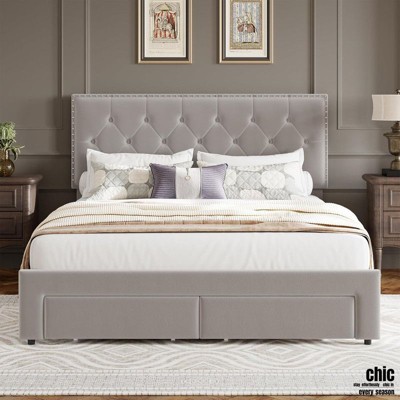 This upholstered platform bed frame features 2 smooth-glide storage drawers, perfect for organizing clothes and bedding. Wrapped in soft velvet with tufted buttons and nailhead trim, it adds elegance and comfort to any bedroom. The tall, padded headboard offers strong back support and adjusts to fit different mattress heights. Built with sturdy wooden slats for quiet, stable support—no box spring needed. Easy to assemble with all tools and instructions included.
