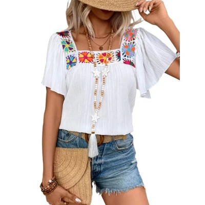 Jojoka Women Short Sleeve Babydoll Tops V Neck Button Up Ruffle Hem Slim Teen Girls Shirts White M