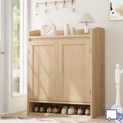Elegant Entryway Storage: Stylish wooden shoe cabinet with warm tones adds a clean, inviting look to any hallway, dorm, or small apartment.