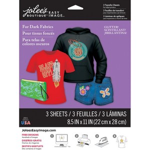 - This package contains Jolee's Easy Image Transfer Sheets - Glitter For Dark Fabrics, three 11x8-1/2 inch transfer sheets, free designs and how-to instructions.