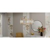 A light gold finish and clear textured glass are the highlight of the Jolie collection. Pretty gold flowers adorn the glass panels, adding a touch of feminine beauty to the classic design. Available as a semi-flush mount, mini pendant light or in two sizes of pendant light, Jollie is a charming addition to any living space.