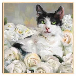A tuxedo cat lounges by delicate white roses in this charming framed canvas print. This piece's intricate details and tranquil air capture the beauty of feline grace. Printed on only top-quality canvas with first-rate technology, every brushstroke is distinctive and defined. Plus, with printing that covers the expanse of the canvas, framing is unnecessary and hanging your new artwork is a cinch