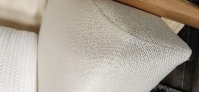 The fabric feels very cheap and strange, looks almost like a light yellow rather then a beige. It arrived with scratches, dents and spray paint on the side? Wanted to like it but it's just not a good quality chair for how much it costs.