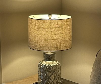 Featuring an antiqued silver finish applied within the lamp's body, this transitional table lamp boasts modern elegance to complement any contemporary decor. The linen drum shade is smooth and stylish, complementing the textured quatrefoil trellis pattern on the body. Finished in a silk-wrapped cord and chrome finial, it would be lovely on a bedside table or in a living room.