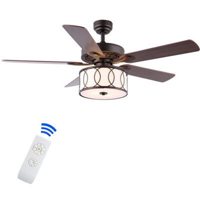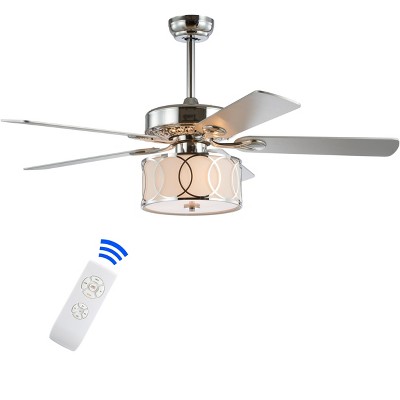 Our 52" ceiling fan's tailored design has a trendy drum lamp shade trimmed in chrome for an elegant, modern finish. Five reversible blades provide plenty of air flow by remote control. A diffuser panel conceals 3 LED light bulbs for a polished look.