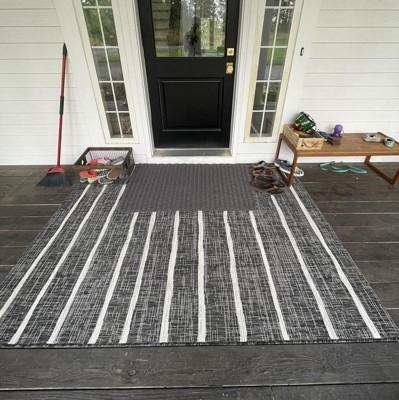 Great outdoor rug! Very happy with the pattern and the durable feel of the rug. Looks great on my porch layered with a doormat.