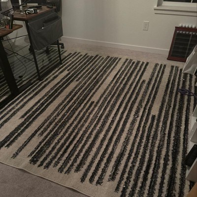 Love this modern style rug. Perfect for my family room. I ordered the 9 x 12 and it fits great under my sectional couch. Color is cream so the black stripes pop. Fits the price.