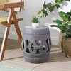 Our drum-shaped ceramic Chinese garden stool brings good fortune with a central band of lucky coin symbols. Chinoiserie garden seats are loved by traditional design fans, but our solid gray matte gives this stool a modern touch. Use it indoors or outside as a cocktail table, garden seat, or plant stand.