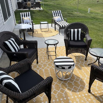 With its geometric design inspired by Moroccan patterns, our Boho-chic rug adds eclectic style to an outdoor porch or patio. Varied tones of black and charcoal mingled with a light gray pattern give this rug a hand-woven, vintage vibe. The flatweave design is great for high-traffic spaces indoors too.