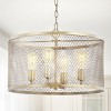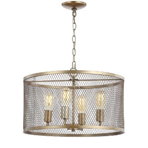 Industrial style gets a touch of glamor with the gold finish on our modern drum pendant. Four Edison-style LED bulbs illuminate a diamond-pattern metal mesh drum shade. This versatile light fixture is perfectly sized for a dining room, kitchen, bedroom or entry.