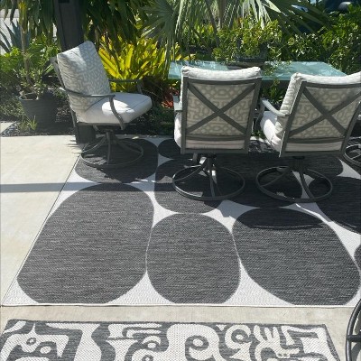 This rug's modern geometric pattern is inspired by organic shapes in Scandinavian design. It's made from durable synthetic fibers woven into a bold pattern. Use this stylish rug outdoors, or in the bedroom, living room or dining room.