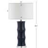 This eye-catching navy ceramic table lamp takes its inspiration from the beauty of natural bamboo. The resulting look is a perfect balance between Asian and modern styles, with a preppy flair. Nickel accents, a crystal base and a white cotton drum shade keep the look contemporary and fresh.