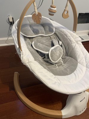 Stay near and watch baby during use. This product is not safe for sleep or unsupervised use. If baby falls asleep, remove baby as soon as possible and place baby on a firm, flat sleep surface such as a crib or bassinet. The Jool Baby Nova Nature swing is an entertaining and happy place for your infant to enjoy. Its white, gray and natural color scheme blend beautifully with any décor. The swing sways gently from side-to-side, perfect for the baby who loves music and movement. You can play music for baby from the Bluetooth speaker by connecting your smartphone or choosing the ten preset melodies. This baby swing is easy to assemble and lightweight, so you can set it up anywhere. The canopy and toy bar are interchangeable, and feature beechwood toys to keep baby entertained. Recommended for infants 0-6 months and up to 20 lbs.