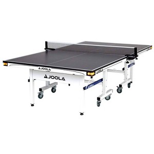 The JOOLA Pro-Elite Table Tennis Table is the perfect table for anyone looking for a fun-filled game of ping pong with some added style. This ping pong table is sure to become a centerpiece in your office or home with its unique black charcoal top, corner ball holders and magnetic abacus scorers. Each corner can hold up to 3 40mm ping pong balls and the two included magnetic abacuses attach to the side of the table. This awesome table tennis table comes 95% pre-assembled and is ready to play in just 10 minutes! A sleek frame and separable nesting halves make this table perfect for compact storage. The professional-grade MDF (medium density fiberboard) surface creates a consistent ball bounce and durability. Additionally, the 2 inch apron and 2 inch diameter sturdy steel legs are used to create a durable table that lasts for years. The ping pong table legs feature adjustable height levelers to ensure a level playing surface and 3-inch locking caster wheels for added stability. The JOOLA Pro-Elite Table Tennis Table features dual safety anti-tilting locking devices to ensure safety when the table is in both playing and storage positions. Simply fold one of the table halves and you can play solo with single player playback mode! The included ping pong net and post set features a simple, removable clamp post and an adjustable net tension system. The JOOLA Pro-Elite Table Tennis Table and Ping Pong Net Set are USATT approved. Start playing like a champion with equipment developed for champions! JOOLA is a proud sponsor of the US Open and the US National Team.
