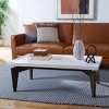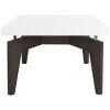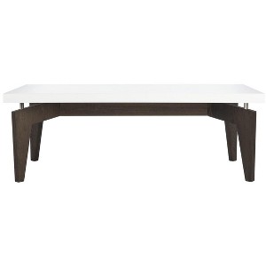 The smooth white lacquer top of the low slung Joseph coffee table appears to float on metal posts that connect it to a base of dark brown wood grained legs. Graphic and sleek, the surface of this coffee table is easy to clean and great for entertaining. Care Instructions: Dust regularly with a soft, dry cloth. Never use oiled or treated cloths on lacquered finishes. Some finishes can be wiped with a damp (not wet) cloth, followed at once by rubbing with a dry cloth to remove fingerprints and smudges. For persistent spots, gently clean with a soft cloth and a solution of water and mild soap, make sure to wipe dry. Use adhesive felt pads, coasters and placemats to protect your furniture.