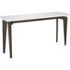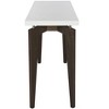 Urban yet refined, the Joseph console floats a shiny white lacquer top resting on thick metal posts to a base with dark brown wood grained legs. Graphic and sleek, this console table is a canvas for interesting displays of collectibles, books and more.