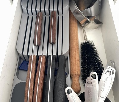 Loving this knive organizer! Beats digging around in a drawer trying to find the right knife and keeps hands safe at the same time. The compact design allowed me to use the Joseph double silverware organizer in the same drawer with the knife organizer, freeing up space for more kitchen items. This product was well thought out and is well built. Highly recommend!