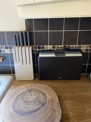 Looks great next to my black kitchen and love the different boards being nice and neat. Only downside and unfortunately it’s quite a big one is that the outside rim of the chopping board is raised so when using a big knife it’s not easy to cut all the way through