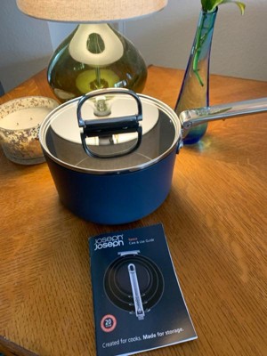 [This review was collected as part of a promotion.] I just received the Joseph Joseph space saving saucepan, and this is a great product. I love the fact that the handle folds in and is easily stackable and easy to put away without having to worry about the handle sticking out. The lid handle also folds down which makes storage a breeze.The color is a beautiful dark blue, it is very durable, the handle feels good in your hand, and it heats food evenly without burning This pan is very well made.