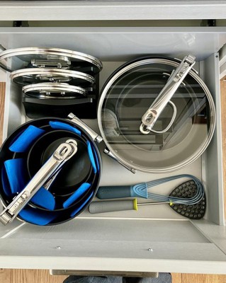 Best pots and pans I've ever had! Beautiful colour and perfect sizes. We bought the Wok as well and they are all so easy to clean. The storage of these are just so easy. I was wondering if it was going to be a pain getting them on and out but I've had no frustration with this at all as it's much easier than digging through the classic pots and pans being stacked in a corner cupboard. These just fit on my drawer.