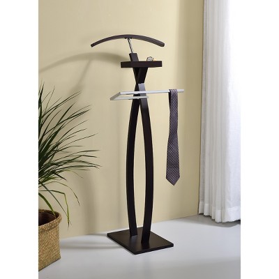 Josh Valet Stand, contemporary modern design with bend wood hanger. The wide bend wood hanger allows you to hang your coat and suit on it. A chrome trousers bar for trousers, belt and tie. With two colors to choose from dark walnut and white, this valet will sure add a touch of luxury to any space.
