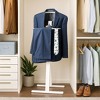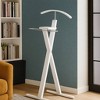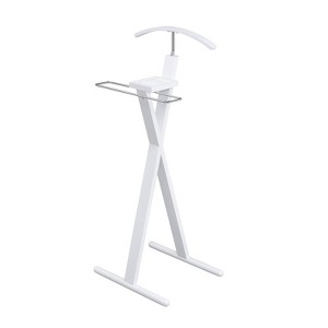 Josh Valet Stand, contemporary modern design with bend wood hanger. The wide bend wood hanger allows you to hang your coat and suit on it. A chrome trousers bar for trousers, belt and tie. With two colors to choose from dark walnut and white, this valet will sure add a touch of luxury to any space.