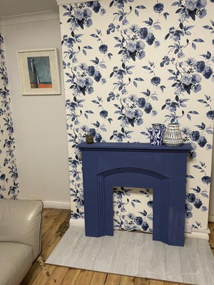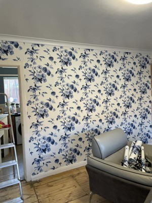 A full roll of this product is 20.5 inches wide and 396 inches long. A full roll can cover up to 56 square feet depending on the design match and pattern repeat. A sample of this product is 8 inches by 11 inches. Boho Bloom is a beautiful watercolor style trailing floral wallpaper that is perfect for creating a classic yet updated look. The captivating tones of mid to deep blues perfectly capture the intricate detail of the watercolor flowers and foliage, which elegantly trail up this statement design. We recommend placing it with antique furniture and natural tones for a classic coastal look. Offers a smooth, untextured finish. Offset match with a 25.2 inch pattern repeat.