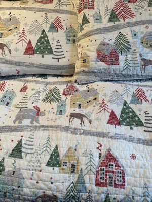 The Joulset Reversible Quilt Set by Levtex Home is inspired by vintage Christmas storybook drawings. Offered in vintage red, green, teal and white, this design will immediately transform your bedroom. This reversible quilt features a scenic Christmas holiday in the woods in an sketch, line drawing design on the front, reversing to a small white snowflakes on a grey ground on the back. The Quilt and Sham have a cotton front and back, filled with a cotton-rich filler, and are machine washable. Enjoy this for years to come!