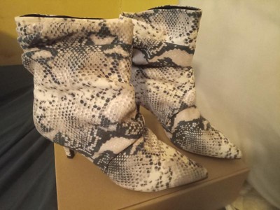 An adorable faux bootie with a perfect heel but way off on the sizes. I normally wear a size 10 but this bootie doesn’t have a zipper so I sized up to an 11, couldn’t get it on at all… way too small.