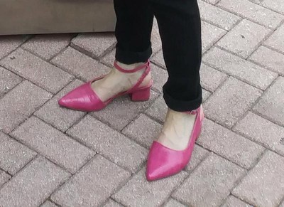 [This review was collected as part of a promotion.] Cute pink color. Nice low heel height. Walking in them rubbed my two little toes pink which hurt a bit. The pointy toe style also rubbed my big toe a bit, seems like it would aggravate a bunion. Thankfully there is an ankle strap to keep the shoe on my foot. I would have preferred the ankle strap to be stretchy. Overall very cute shoes but not very practical for walking. I walked about a half mile in them on city sidewalks yesterday and by the end my toes were rubbed pink and hurting. Ok for standing and sitting but walking in them hurts the toes.