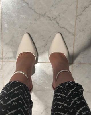 [This review was collected as part of a promotion.] This size 9.5 Miriem off white patent leather shoe is for someone who is used to wearing a high heel shoe. The heel is very narrow and HIGH which makes it a challenge for walking and the ankle strap adds a nice touch but is hard to buckle since it is practically at the back of the foot. It fits true to size, a very pretty shoe even on my wider foot but too high for me to wear even if only for a one day event. This item Felt true to size and the width Felt true to width. I received an incentive to write this review.
