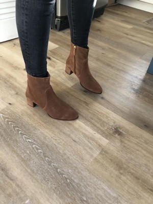[This review was collected as part of a promotion.] This boot is nicely designed, has a great heel height, and fits well and thats why I gave 2 stars for this rating. However, the suede/leather material in the color Camel was poor. The color from the boot rubbed off onto the shoe bag it was shipped in, it gives an overall cheap look, and makes the boot itself look dirty. To give perspective, I also purchased a few pair of faux leather shoes and they're a world of difference better.