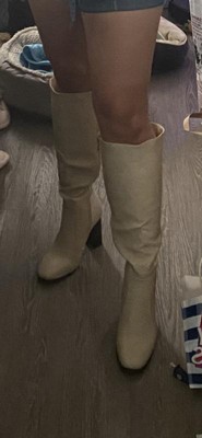 [This review was collected as part of a promotion.] Great, versatile option for all your fall fashions. I bought them in black also. Was a bit disappointed when the heel on one of these arrived broken and bent out from under me within 20 minutes of having them on. But I immediately contacted customer service and a replacement is already being coordinated. The heel is a bit higher than I would normally go, but it’s super comfy, even after the whole day. The wide-calf isn’t super wide though. Mine are 18” and they’re snug.