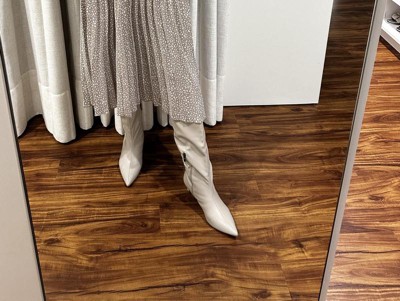 [This review was collected as part of a promotion.] I wore this on Sunday with a skirt and it looked great! My problem with it is the calf is way too wide, so I wouldn’t wear it with pants. I can still wear it with midi skirts/dresses. I did find I was worried for the material. I think the vinyl is not very high quality so it could snag/scratch if you’re not careful. I will probably still keep it and see how long it will last. It is a beautiful boot, and very very comfortable. I bought it to wear specifically with skirts, so I will keep it!
