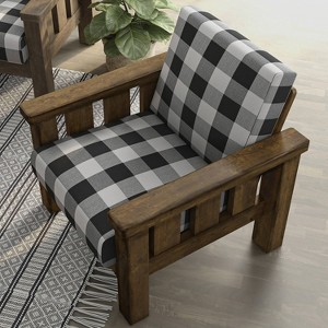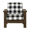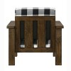 Add a farmhouse classic touch of comfort to your living space, durable and stylish this chair features an exposed wood frame with a slatted back and squared arms with slatted sides. A rustic brown finish and comfortable black and white plaid fabric upholstered cushions, giving you support as you sit back and relax and enjoy.