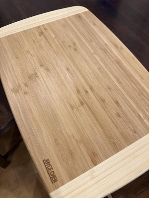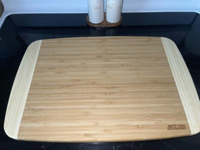 I received the Joyce Chen burnished bamboo cutting board and exchange for my honest review from Target Hey bullseye. The Cutting Board itself is a nice large size. And it's aesthetically nice in my kitchen. It does say that it's stronger than maple and it won't Mark or dull. But when I received my product, if you look at my pictures you can see there's already a deep scratch in it. I've only used this for cutting vegetables. And it does scratch. I mean as with any other cutting board you are going to have Nick's and scratches in it. But I thought this would hold up a little better. I will never use it for cutting any kind of meat. Because it's only hand washable, I don't feel like it's going to get clean enough to use this for meat. So I'm only going to use vegetables on it. Lately I just been using it as a charcuterie board. It works so much better for that. And I have it in my kitchen on display.