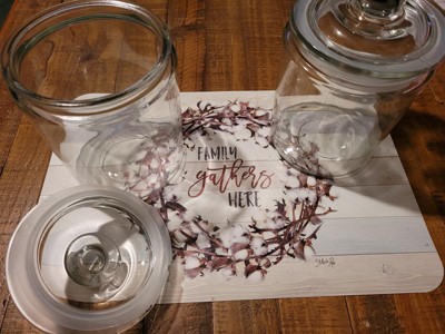 - Traditional Cookie Container with A Versatile Touch: Angled, like the cookie jars with lids you see at the corner store but also made to sit bolt upright as you please. Two glass jars with lids, 75oz capacity, 7" across, 4" wide with a 4" wide mouth - perfect glass jars for laundry room or dog treat jar.