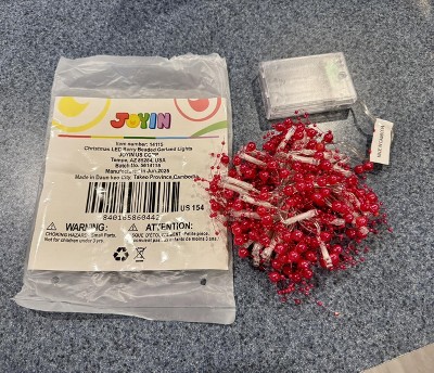 No timer for these. The berries are more pink than red and the lights are yellow not off white. There are not individual strands like the photo it's just one long string so it will not cover the area as described. Took a long time to ship Very cheap looking. Will be returning. In my picture you can see the red berries in my garland and the pink ones that are in these yellow lights. The candle light that's in the picture is an antique white and as you can see it even looks white compared to the yellow ones.