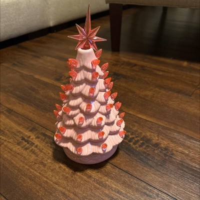 Joyfy Ceramic Christmas Tree, 12'' Pink Mini Tabletop Xmas Tree with Extra Clear Top Star & Bulb, Christmas Decorations Indoor