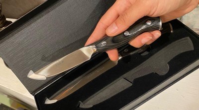 [This review was collected as part of a promotion.] I got these knives for free on Influenster in exchange for my honest review. These knives are awesome. They are so sharp it takes very little effort to cut. I used them to cut chicken and they did amazing! They come in a beautiful black velvet case and also have a guard that you can slip on when not in use. Overall, this a great addition to any knife collection.