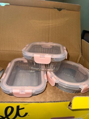 [This review was collected as part of a promotion.] These are so cute! The pink is perfect. I love that they are glass and the lids are snap on. They stack really well so they don’t take up much space. I love them for my lunches!