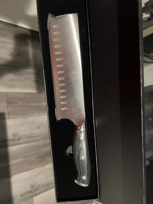 [This review was collected as part of a promotion.] I received the JoyJolt - JoyJolt 7-in Nakiri Knife High Carbon Steel Kitchen Knife and I feels like a very high-end knife. Has a very smooth and clean cut. The knife feels great and comfortable in your hand. The handle is smooth, with a pattern of dark synthetic wood.