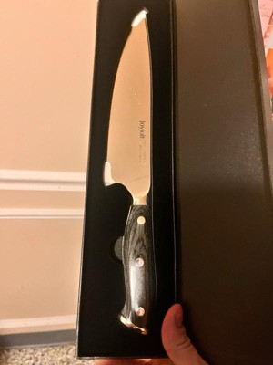 [This review was collected as part of a promotion.] I’m so happy to receive a good, new, quality knife! It feels pretty light, but cuts precisely, efficiently, and quickly. Upon first use, it seems pretty durable and like it’ll last awhile before it goes dull. I’m excited to try it out with harder to cut fruits and vegetables to really test its limits!